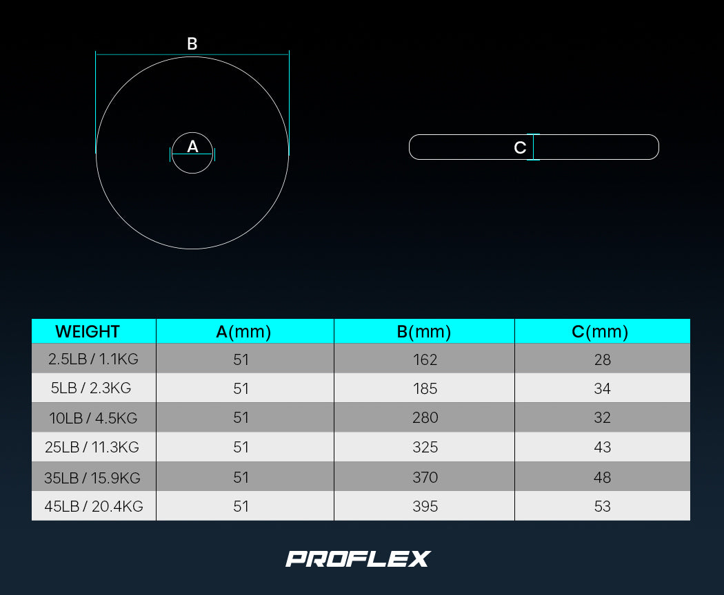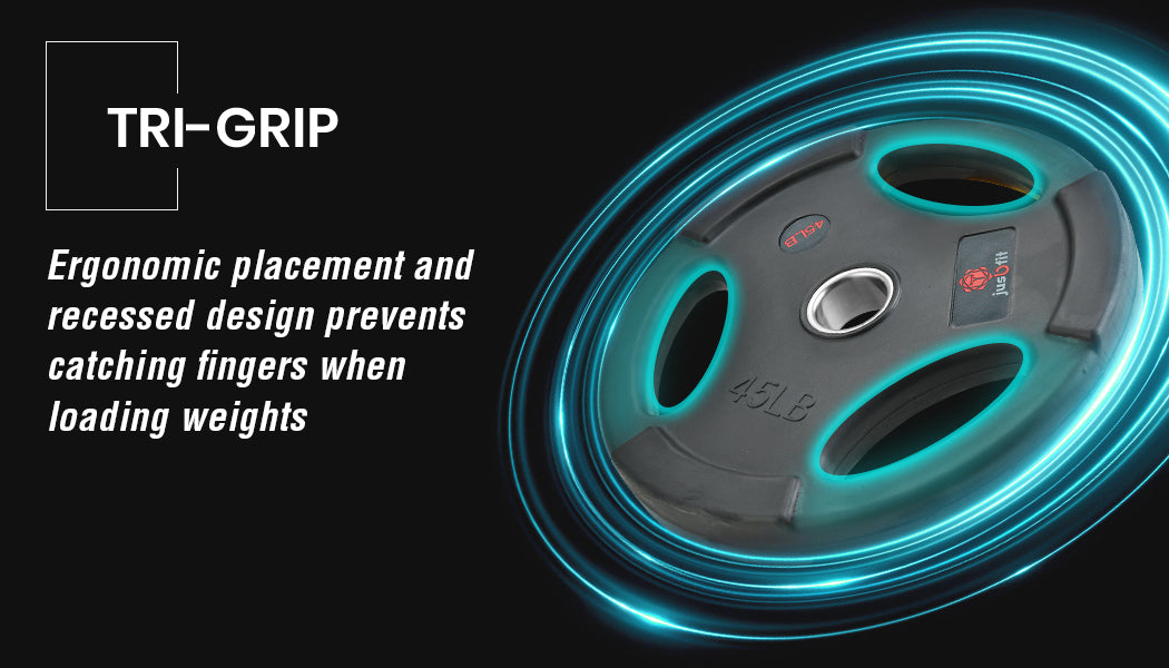 The JusBfit Series launched by Proflex is true commercial-grade gear that makes it ideal for anyone looking for gear that will stand the test of time. The range of Tri-Grip Olympic Weight Plates are heavy-duty in structural integrity with one-piece forged construction and ergonomically engineered for comfortable and safe handling.They feature ultra-rugged, split, crack and peel resistant rubber casings to protect your floors and other equipment.