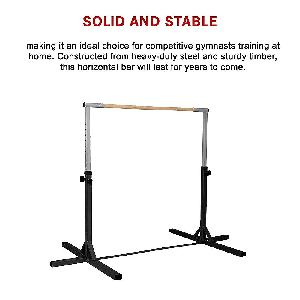 Whether your child is a serious gymnast or just wants to have fun, this kids' horizontal gymnastics bar by Randy & Travis Machinery is just the ticket. Putting safety first, this training bar is solid and stable, making it an ideal choice for competitive gymnasts training at home. Constructed from heavy-duty steel and sturdy timber, this horizontal bar will last for years to come. With its four knobs, this horizontal bar is easily adjustable for kids of all ages.