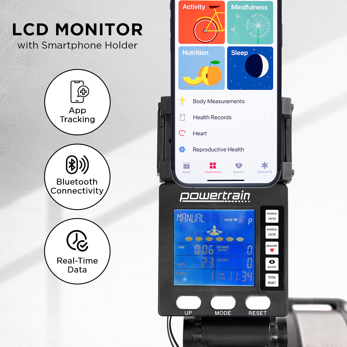 Looking for a low-impact way to exercise? Then you'll love the Powertrain Air Rowing Machine. This rower has 10 air resistance levels so you can adjust the intensity, a backlit LCD screen with real-time data reporting and a Bluetooth-enabled console that connects to various fitness apps. It also features a contoured seat, adjustable footrest and ergonomic handle for more comfortable workouts.