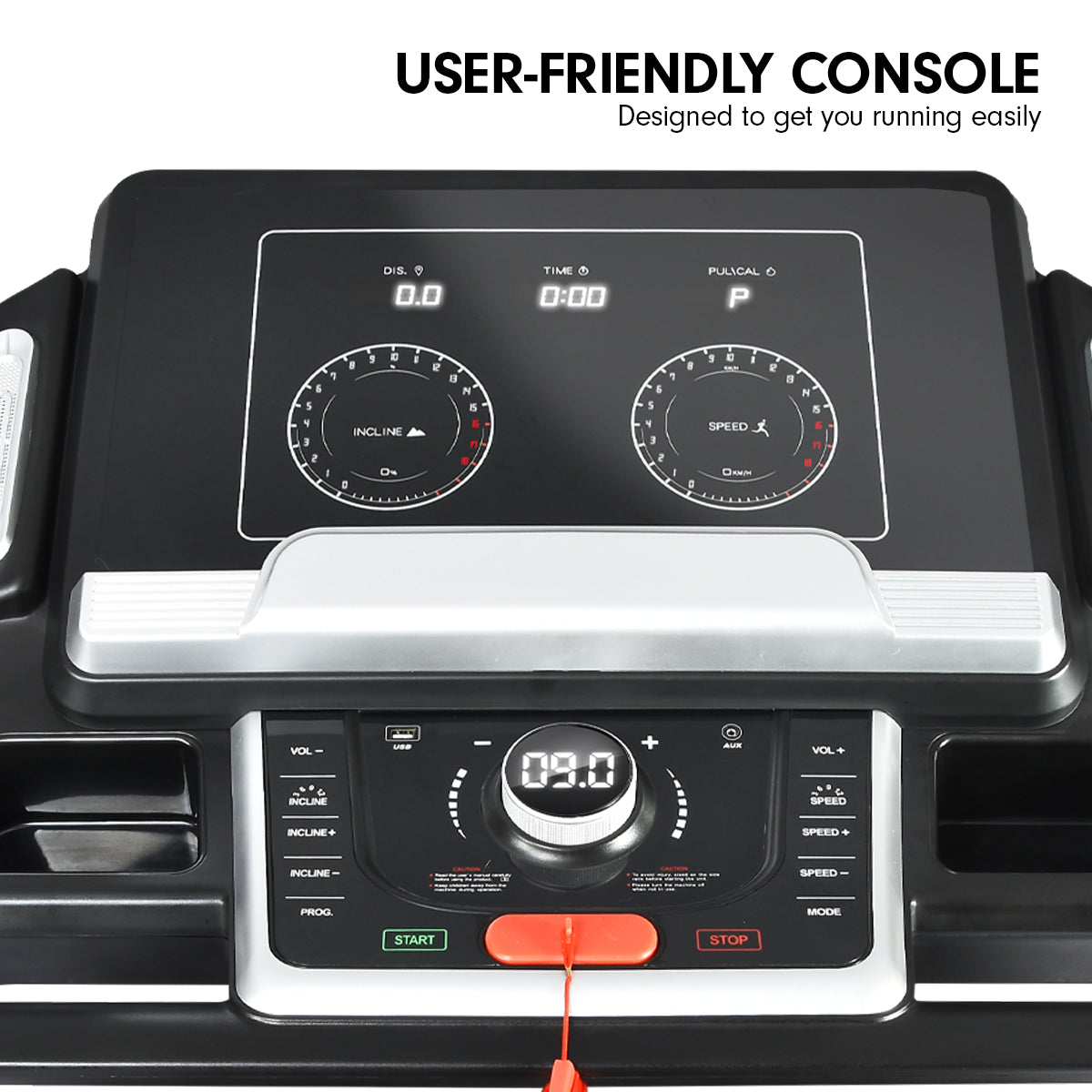 This home treadmill is built to impress with its striking design and spacious 580mm x 1450mm running deck. The shock-absorbing system cushions every stride, allowing you to safely and comfortably work out.